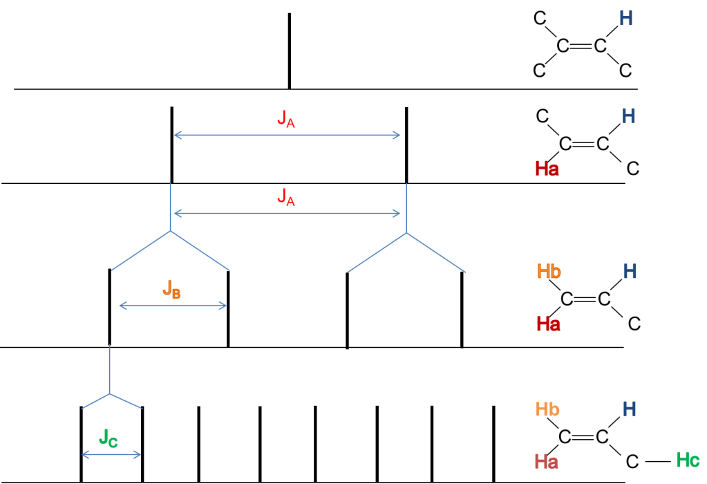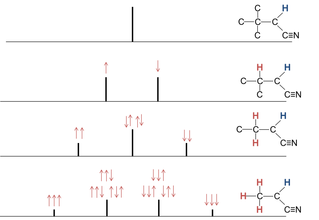 The signal from the proton coloured blue is dependent on the number of protons on the adjacent carbon. If there are no protons then the signal is not split. If there is one proton on the adjacent carbon then the signal is split into two (one for the population of the red proton that is aligned with the magnetic field and one for the population of the red proton aligned against the bulk magnetic field). The intensity of each signal is half that of the unsplit signal. If there are two protons on the adjacent carbon the the result is a triplet with the middle signal being double the intensity of the outer two. Again the sum of the intensities of all three peaks is equal to the intensity of the singlet where there are no protons on the attached carbon. With three attached protons on the adjacent carbon the result is a quartet with the centre two peaks having three times the intensity of the outer two peaks.