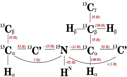 J-Couplings occur between all NMR active nuclear that are connected through bonds. The magnitude of coupling is related to the proximity of the coupled partners, the magnetic moments of the two partners and the dihedral angles involved. These couplings can vary significantly in magnitude as can be seen it the coupling constants seen between nuceli in within proteins that have been isotopically labelled with 13C and 15N. These couplings can be used to transfer magnetisation between nuclei specifically based on the magnitude of the coupling constants.