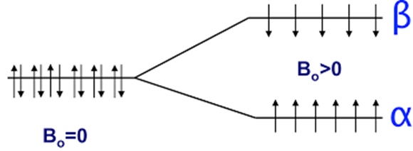 Low and high energy states. The lower energy state is slightly more populated than the high energy state (Boltzmann distribution).