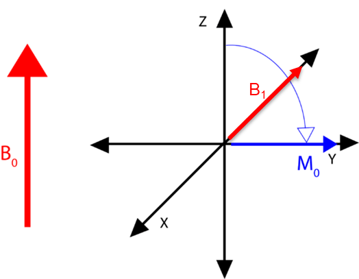 A radio frequency pulse matching the rotational frequency of the nuclei is applied 90° away from the bulk magnetic field (B1). The RF pulse is then stopped when the net magnetisation has rotated 90°. In this case the B1 field is applied along the -x axis so that the magnetisation rotates towards the y axis where the detector lies.