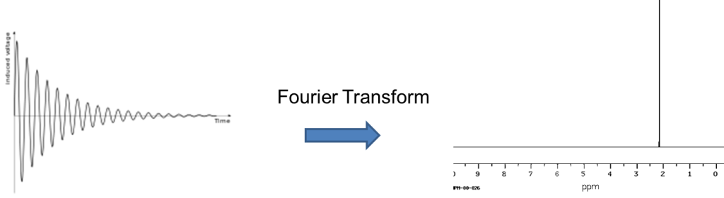 As the nuclei have a magnetic moment they will generate a current in the coil giving a sinusoidal curve which decays back to zero. This is the Free Induction Decay (FID). The FID is the converted from a time domain to a frequency domain using the Fourier Transformation.